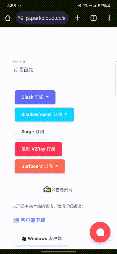 在 「 订阅链接 」 中找到 「 Clash订阅 」 点击 「 一键导入Clash 」 按钮