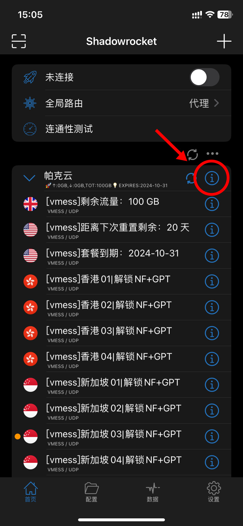 回到 Shadowrocket 首页点击 「 帕克云 」 后面的感叹号,打开编辑。