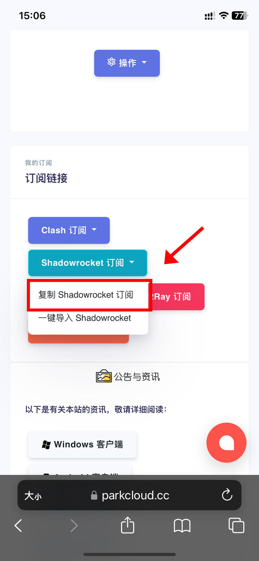 在官网 「 订阅链接 」 中找到 「 Shadowrocket订阅 」 ,点击 「 复制 Shadowrocket 订阅 」 按钮来复制订阅地址