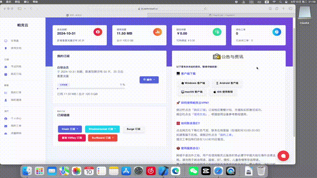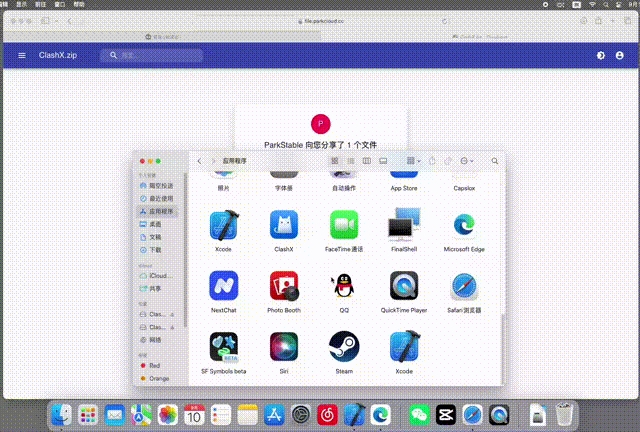 官网首页下载客户端后,打开下载的 「 ClashX.dmg 」 文件,将 「 ClashX 」 拖拽到 「 Applications 」 文件夹当中